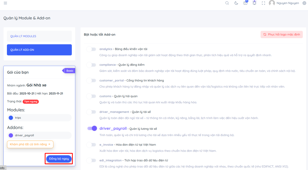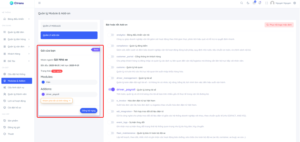 Lưu ý: Nếu gói đang Tạm ngưng, không thể bật thêm Module/Add-on.