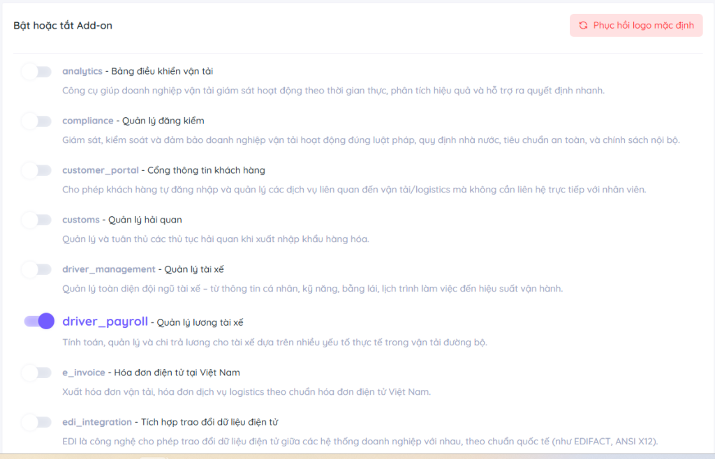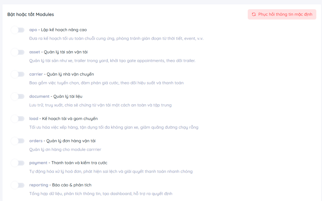 - Bật (ON): Module được kích hoạt và hiển thị trên hệ thống