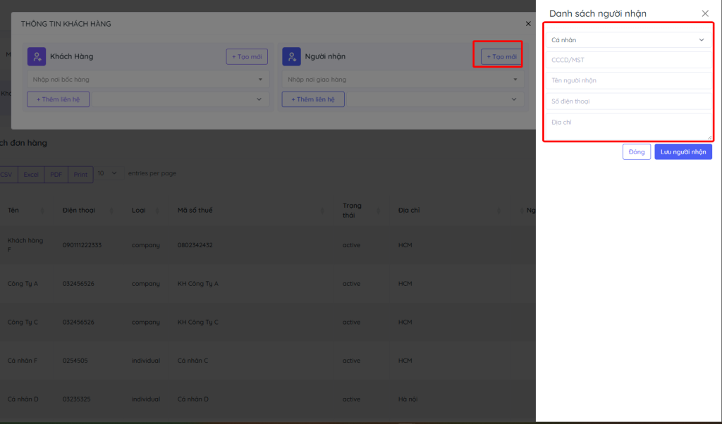 Bước 1: Mở form tạo NGƯỜI NHẬN